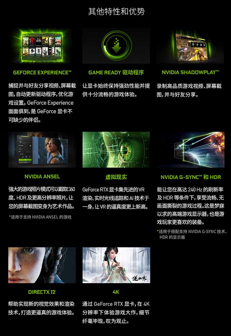 支持Simultaneous Multi-ProjectionVR圖像矯正技術,VRWorks Audio虛擬現實音頻技術,Ansel截圖功能,PhysX物理加速技術,NVIDIA CUDA,PureVideo HD高清硬件解碼,動態超級分辨率,MFAA,GeForce 3D Vision,GameWorks™,G-Sync™-Ready,GameStream™-Ready,GeForce ShadowPlay™,GPU Boost™