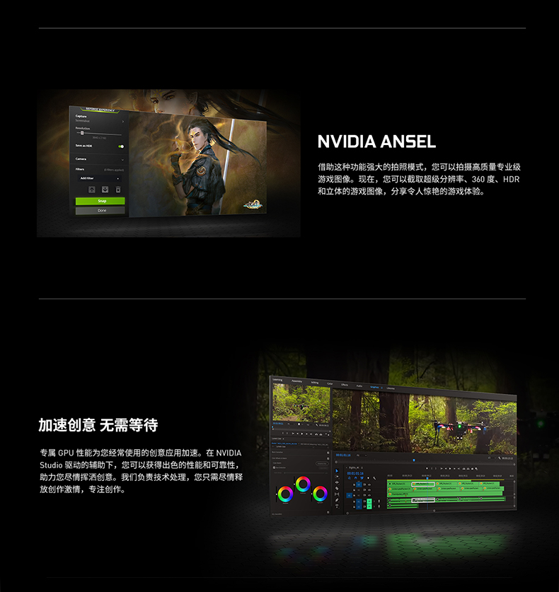 - 支持Simultaneous Multi-ProjectionVR圖像矯正技術,VRWorks Audio虛擬現實音頻技術,Ansel截圖功能,PhysX物理加速技術,NVIDIA CUDA,PureVideo HD高清硬件解碼,動態超級分辨率,MFAA,GeForce 3D Vision,GameWorks™,G-Sync™-Ready,GameStream™-Ready,GeForce ShadowPlay™,GPU Boost™